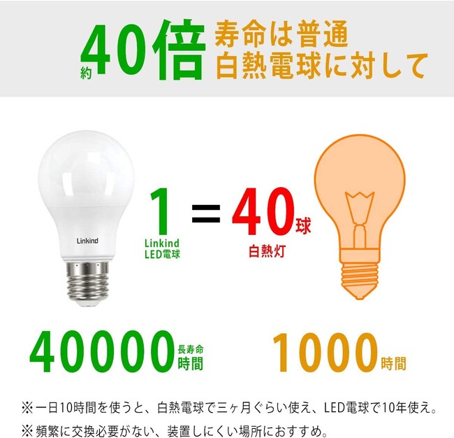 LinkindのLED電球1個の寿命は40000時間に達成、普通の白熱電球は1000時間。すなわち、一日10時間を使うと、白熱電球で三ヶ月ぐらい使え、LED電球で10年使え。頻繁に交換必要がない、装置しにくい場所におすすめ。ご注意:密閉形器具対応でき、断熱材施工器具と調光器対応できません。