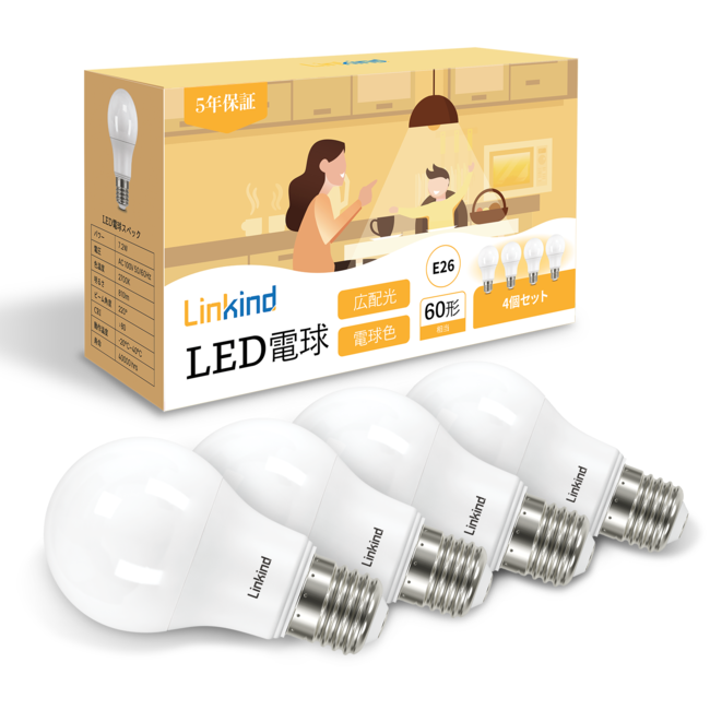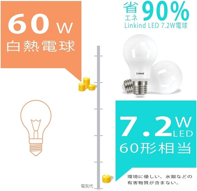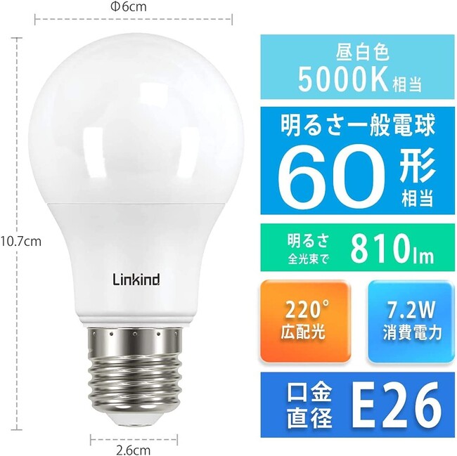香港春暉株式会社 Linkind LED電球 A60 口金直径E26 60形相当(7.2W) 810lm 昼白色 広配光 密閉形器具対応 長寿命40000時間 高演色 省エネ PSE認証