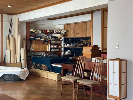 岐阜現代美術館は、国内外で高い評価を受けた抽象画家、篠田桃紅(1913‐2021)氏の作品を世界有数の規模で所蔵する美術館です。同館の2階には、篠田氏が1970年から多くの時間を過ごした東京のアトリエが忠実に再現されており、家財や床などがそのまま移設され、200本以上の筆などが展示されています。