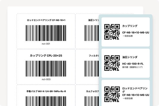 商品コード・社内管理番号・資産番号・SKUなど、任意のテキスト情報をバーコード/QRコードとして自動生成できます。