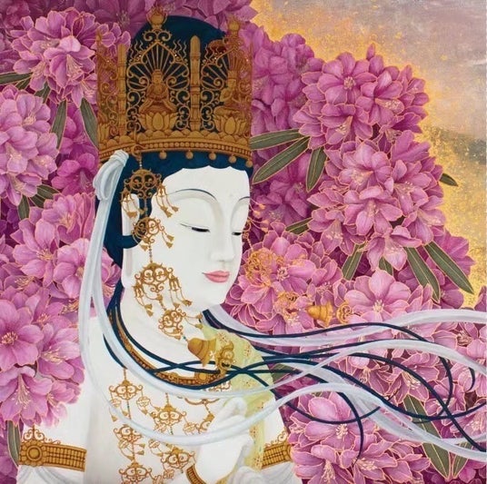ご予約先着200個限定で、『天風てらす』の2Fで訪れる方々を見守っている大日如来様の大作「あまねく照らす」(観音画家 木綿花先生作)がプリントされたスカーフを差し上げます。