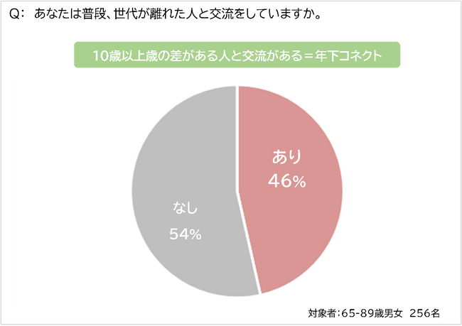 上記の質問で世代間コネクトを持つ人の割合を調べました。ここでは高齢者で10歳以上年下の人と交流があることを「年下コネクト」、20~64歳で10歳以上年上の人と交流があることを「年上コネクト」で分け、割合を比較しています。その結果、年下コネクトを持つ人は46%、年上コネクトを持つ人は49%でした。