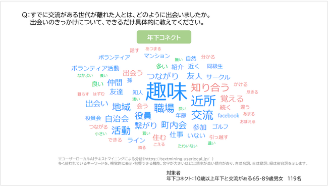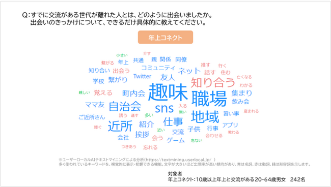 世代が離れた人と出会ったきっかけを自由回答で尋ね、分析ツールを使用して回答の中から出現率の高い単語を抽出したところ、年下コネクト、年上コネクトともに「趣味」が多い傾向にありました。
