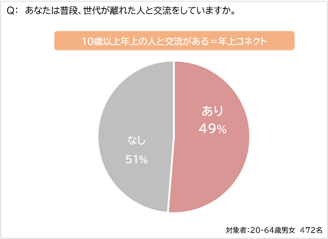 1.世代間コネクトを持つ人は約半数。世代間交流の良い点として「新しい気づき・価値観を得られる」「同世代では分からない・知らないことを教えてくれる」が上位に挙がった