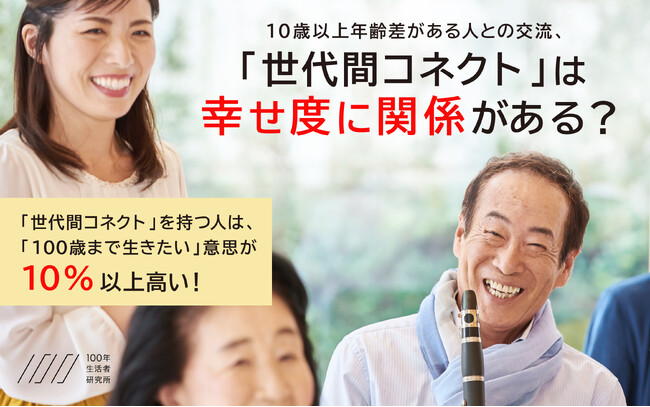 100年生活者研究所が今年2月に行った調査では、「敬老の日」に祖父母・両親やシニアの方に対して、「特に何もしていない」と回答した人が72%に上り、世代間のつながりが希薄になっていることがうかがえました。こうした背景を踏まえ、当研究所は世代間交流が人生100年時代の幸せにどのように影響するのか調査を実施しました。その結果、家族・親戚・職場以外で年齢が10歳以上離れた人との交流を「世代間コネクト」と定義すると、世代間コネクトを持つ人は約半数で、趣味で出会う傾向にありました。また、当研究所設立時の調査で、100歳まで生きたいと考えている人が3割だったことを踏まえ、「100歳まで生きたい」という気持ちへの影響を調べたところ、世代間コネクトを持つ人は、持たない人より1割以上「100歳まで生きたい」気持ちが高いことがわかりました。調査結果に対し、シニアインフルエンサーの大崎博子さんは「普段、交流している人は年下ですが、スポーツという共通の話題で盛り上がっています」というコメントを寄せています。