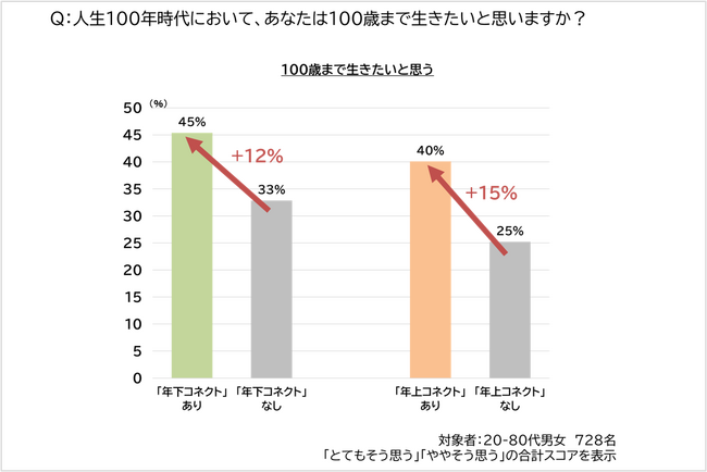 100歳まで生きたい意向を尋ね、「世代間コネクト」を持っている人と、持っていない人の割合を比較しました。その結果、年下コネクトを持っている人は45%が「とてもそう思う」「ややそう思う」と回答し、持っていない人と比べて1.36倍高くなりました。年上コネクトも同様に、持っている人の方が1.6倍高い結果となりました。