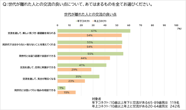 Q1で「交流がある」と回答した人に対して、交流の良い点について質問をしたところ、年下コネクトは「交流を通して、新しい気づき・価値観を得られる」が61%で最多でした。年上コネクトは「交流を通して、新しい気づき・価値観を得られる」「同世代では分からないことを教えてくれる」がともに54%となり、最も多い結果となりました。