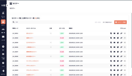 現在はWebinarBaseの提供に加えて、行動を変える機会をつくるセミナー情報サイト「SeminarBase(セミナーベース)」や、完全成果報酬型でご支援するセミナー集客代行サービス、セミナー企画からコンテンツ作成まで行うセミナーコンサルティングサービスなど、セミナーを主催するクライアントのニーズに合わせてサービスを提供しています。