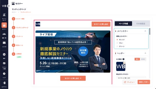 ランディングページ作成機能:フローに従って入力するだけで、簡単にランディングページが完成し、それに合わせてメール、ウェビナーURLの設定も完了します。