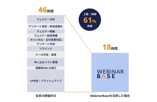 加えて従来の開催方式でかかる時間に比べ、約61%もの時間の削減が可能です。ウェビナー開催に必要な機能が搭載されているのはもちろん、ランディングページやメールなど、テンプレートの用意もあるため、更なる業務の効率化を図ることができます。