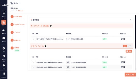 メルマガ送信機能:ウェビナー申込者へ、申込完了メールやリマインドメールなどを設定して配信することができます。またメルマガやステップメールの配信も可能です。