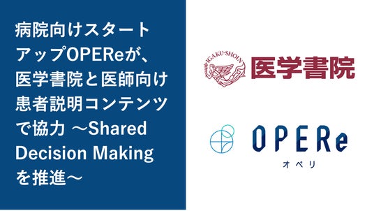 患者と医療者のデジタルコミュニケーションツールを提供するスタートアップ株式会社OPERe(東京都千代田区、代表取締役/CEO 澤田 優香、読み方 オペリ、以下 OPERe)は、医学系書籍の出版において国内トップクラスの株式会社医学書院(東京都文京区、代表取締役社長 金原 俊、以下 医学書院)と患者説明コンテンツの作成において、協力体制をとることを発表いたします。この提携により、医師が行なっている患者説明を共同でデジタルコンテンツ化し、医療現場における働き方改革の推進ならびに患者とのコミュニケーションの質を向上させ、Shared Decision Makingの推進を支援することを目指します。