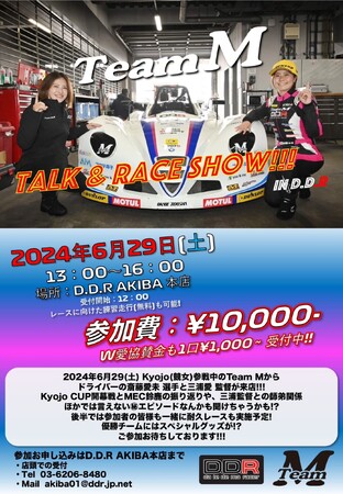 Team Mファンイベントとして、秋葉原のシミュレータショップD.D.R様にて、シミュレータ耐久レースとともに三浦愛・斎藤愛未選手のトークショーなど交流イベントを開催いたします。