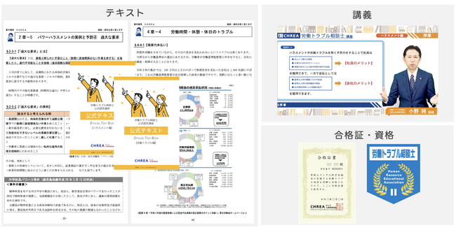 労働法、労務、ハラスメントリテラシーを学習して、企業内での労働トラブルやハラスメントトラブルを未然に予防するための資格です。労務に関する資格としては国家資格「社会保険労務士」がありますが、一番重要な違いは、社労士が【労務のスペシャリスト】として企業と契約するのに対して、『労働トラブル相談士』は【誰もが学習できる、誰もが取れる資格】として、企業内での管理職を始めとする多くの人たちに学習、合格をしてもらい、まるで空気のようにハラスメントリテラシー、労務リテラシーを行き渡らせることを目的としている点です。