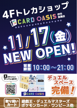 トレーディングカード専門店「S CARD OASIS伊丹昆陽店」が11/17(金)にオープンします。