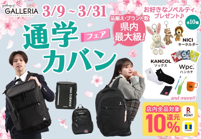 ギャレリア高崎緑町店(株式会社ギャレリア・ニズム)では、同社が運営する複合商業施設「M3㌱」のレンタルスペースにて3/9(土)~3/31(日)の期間限定で【新生活応援フェア】と題し中高生を対象とした通学カバンフェアならびに、社会人向け通勤バッグフェアを開催します。