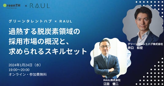 今回の業務提携にあたりまして、2024年1月24日(水)19時より、グリーンタレントハブとRAULの共催セミナー「過熱する脱炭素領域の採用市場の概況と、求められるスキルセット」を開催します。