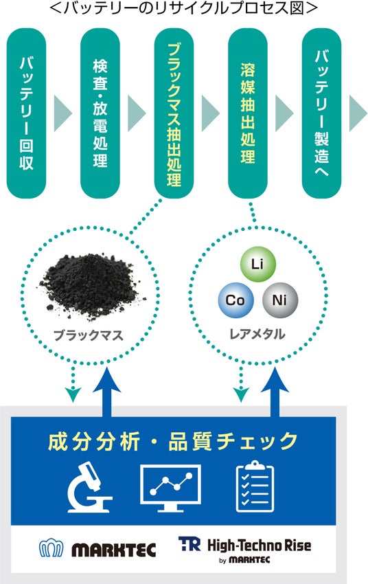 当社及びハイテクライズは、ブラックマス抽出処理や溶媒抽出処理で抽出されたブラックマスやレアメタル(リチウム、コバルト、ニッケル等)に対して、成分分析及びバッテリーリサイクル材料として求められる性能評価や品質チェックの先進サービスをご提供いたします。