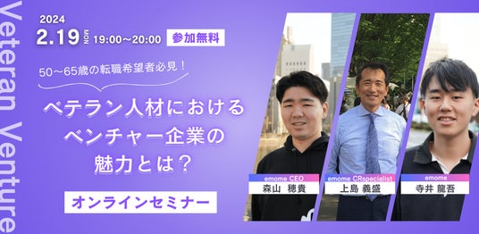 超高齢化社会プラットフォーム事業を運営する株式会社emome(本社:東京都港区、代表取締役:森山穂貴、以下 emome)は2月19日(月)に50歳以上の転職希望者に向けたWebセミナーを開催します。