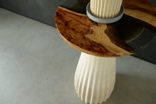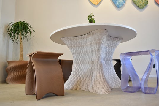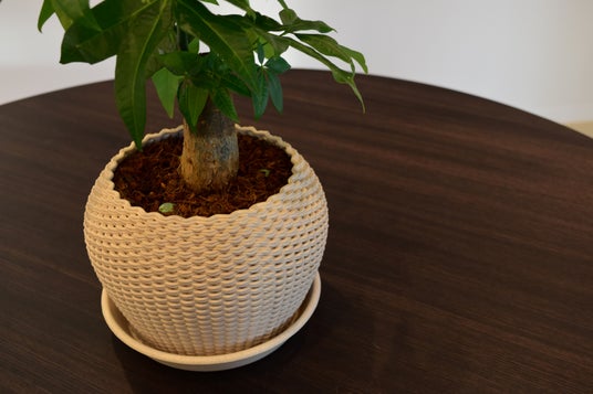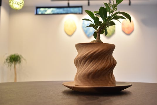 植木鉢 POT-2材料は間伐材を利用した樹脂で作られています。捻じれたフォルムに3Dプリント特有のテクスチャがグラデーションであしらわれたデザインになっており、背の低い植物と相性が良いです。