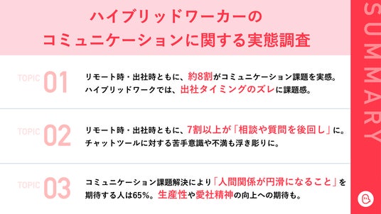 リモートには「状況が見えない」という課題、出社には「周りの目が気になる」という課題があること、そして、チャットというテキストコミュニケーションを得意としない人が少なからずいることもわかりました。