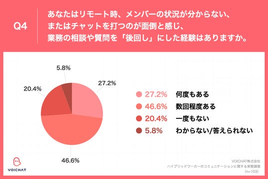 Q4.あなたはリモート時、メンバーの状況が分からない、またはチャットを打つのが面倒と感じ、業務の相談や質問を「後回し」にした経験はありますか。」(n=103)
