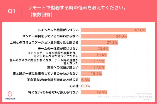 Q1.リモートで勤務する時の悩みを教えてください。(複数回答)」(n=103)