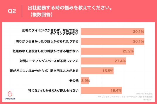 出社時の悩みとしては、「出社のタイミングが合わず、対話できる機会が少ない」と「周りがうるさかったり話しかけられたりする」で同率1位で30.1%。