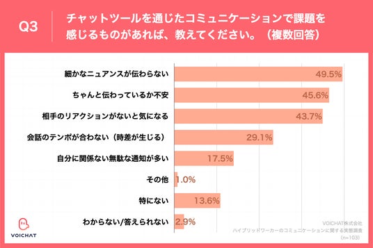 Q3.チャットツールを通じたコミュニケーションで課題を感じるものがあれば、教えてください。(複数回答)」(n=103)