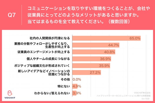 Q7.コミュニケーションを取りやすい環境をつくることは、会社や従業員にとってどのようなメリットがあると思いますか。当てはまるものを全て教えてください。(複数回答)」(n=103)