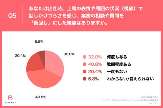 Q5.あなたは出社時、上司の表情や周囲の状況(視線)で話しかけづらさを感じ、業務の相談や質問を「後回し」にした経験はありますか。」(n=103)
