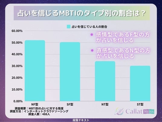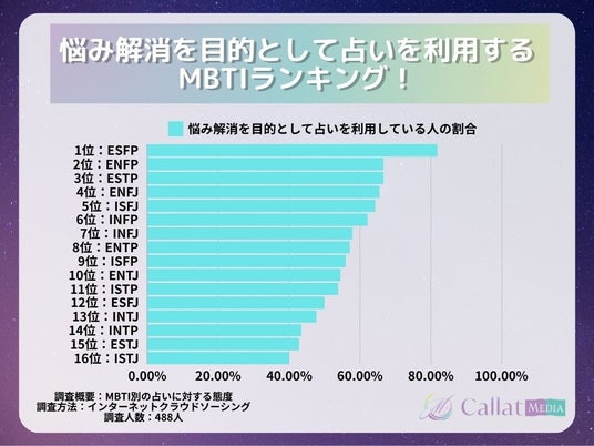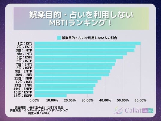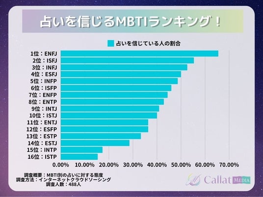 株式会社ALICORN(本社:東京都港区、代表取締役:松浦祐樹)が運営する女性向け占いメディア「Callat media」は、MBTI(16personalities)診断を行ったことのある男女488人を対象に「占いに対する態度」についてのアンケートを実施したので、その結果を報告します。