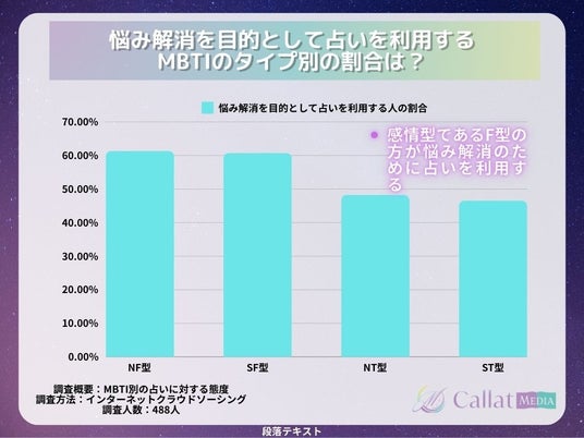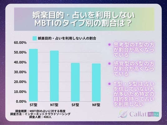 - N型・F型がより悩み解消を目的として占いをする傾向にあり、S型・T型はより娯楽目的もしくは占いを利用しない