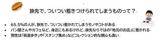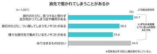 年1回以上観光旅行をしている人に対して、旅先でつい惹かれてしまうことがあるかを聞いたところ、「旅行のたびに、見つけると思わず足が向かってしまう店や場所がある」、「旅行のたびに、つい探してしまうモノ・コトがある」、「様々な旅行先で集めているモノやコトがある」のいずれかに回答した人は65.5%と半数を超えました。多くの人が、旅先で「ついついしてしまう」ことがあるようです。