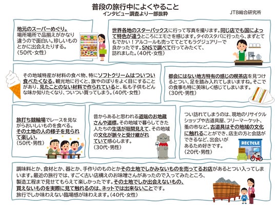 今回の調査では、より具体的な旅行者の関心事を深掘りするために、アンケートだけでなく、インターネット上のチャット形式でのインタビュー調査でひとりひとりの旅行の体験について、詳細を聞きました。その結果、様々な旅先でのこだわりの行動が見えてきました。具体的な発言内容をみてみると、スーパーやカフェなど、身近にもあるけれど、「いつもとは少し違う」その旅先ならではのモノやコトを探す、間違い探しのような楽しみ、旅先の人々やいつもとは違う文化と出会える感覚などが、ついつい惹かれてしまうポイントとなっているようです。
