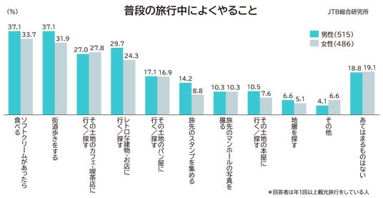 普段の旅行の中でよくやることを聞いたところ、暑い時期ということも関係しているかもしれませんが、「ソフトクリームがあったら食べる」が1位となり、続いて「街道歩きをする」、「その土地のカフェ・喫茶店にいく/探す」、「レトロな建物・お店に行く/探す」が多くあげられました。ソフトクリームやカフェ・喫茶店、パン屋など、食に関する行動は女性が多く行っている印象がありますが、意外にも男女差はあまり見られませんでした。男性の方が女性に比べて比較的多く回答があったのは「街道歩きをする」、「旅先のスタンプを集める」、「地層を探す」で、何かのゴールに向けて達成したい、コレクションしたい、といった意識が垣間見えます。