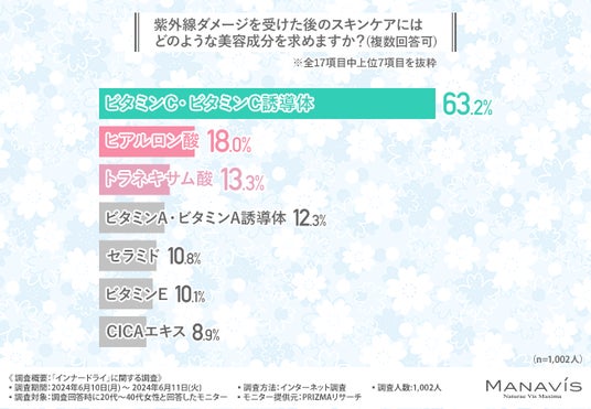 「紫外線ダメージを受けた後のスキンケアにはどのような美容成分を求めますか?(複数回答可)」と質問したところ、『ビタミンC・ビタミンC誘導体(63.2%)』と回答した方が最も多く、次いで『ヒアルロン酸(18.0%)』『トラネキサム酸(13.3%)』と続きました。