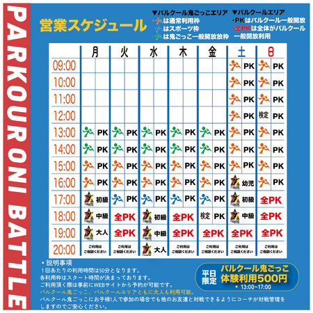 月曜・水曜・土曜にパルクールのクラスが開講し、それ以外は一般開放でどなたでもパルクールに取り組める施設となっています。