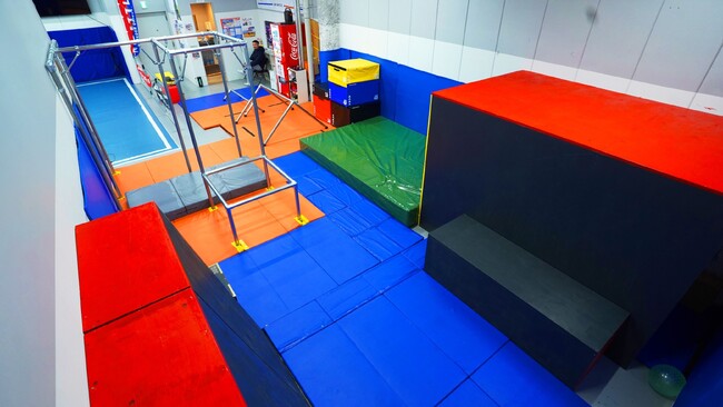 パルクール専門の設備であるオブスタクルを完備しており、大きい箱の上から飛び降りる、小さい箱の上かに着地するなどの動作が可能です。また、傾斜のある台も用意し、壁を蹴る動作やよじ登る動作にも対応。