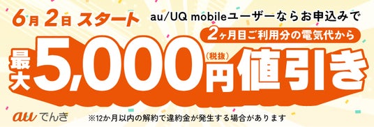 auエネルギー&ライフ株式会社は、数年にわたり継続している物価高騰を受け、au/UQ mobile回線をご利用中のお客さまの家計負担軽減を目的とした「auでんきで家計応援!電気代値引き」施策(以下 本施策)を6月2日より開始しますので、お知らせいたします。