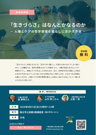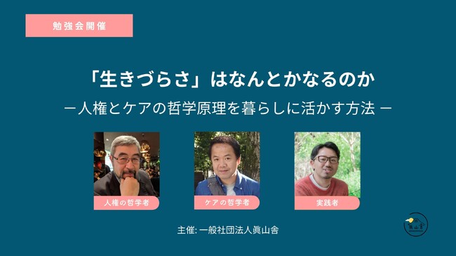 一般社団法人眞山舎(所在地:東京都国立市、代表理事:土屋一登、以下「眞山舎」)は、令和6(2024)年8月21日(水)に、「「生きづらさ」はなんとかなるのか -人権とケアの哲学原理を暮らしに活かす方法 -」を東京都国立市内で開催することが決まりました。「生きづらさ」を抱えるひとが、「生きやすい暮らし」を営むためにはどうしたら良いのか。そのような問いに向き合う機会として、哲学の原理 (ものごとの根本) から、人間が自由に生きることや、他者をケアし、他者にケアされることを考えます。また、哲学的な学びを暮らしの営みに活かすためにはどうしたら良いのかを、実例と共にご紹介します。どなたでもお気軽にお越しいただき、人権とケアの哲学原理を暮らしの営みに活かす方法について一緒に考えられたらと思います。