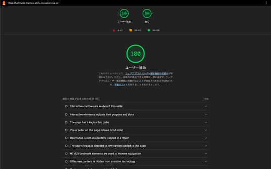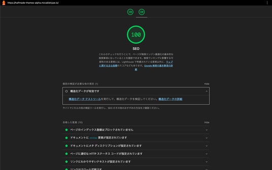 Googleが提供するウェブパフォーマンス測定ツール「Lighthouse」で、SEO/アクセシビリティともに100点を記録。