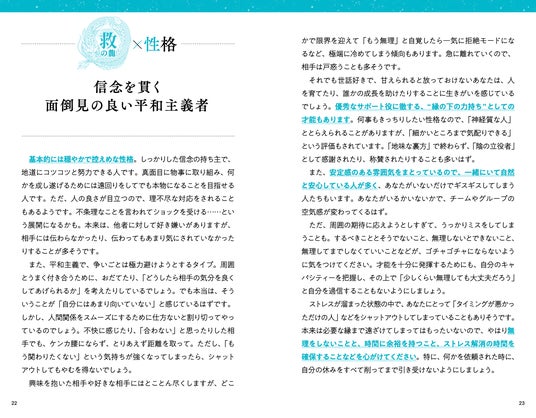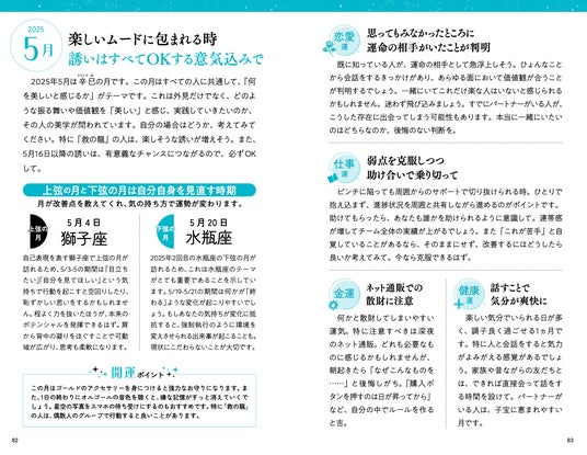 2025年の予言、その注意点や開運法、あなたの基本性格、月運&毎日の運勢、運勢のバイオリズム、総合運、恋愛運、仕事運、金運、健康運、相性、オーラ、何をやってもうまくいかないときの開運アクション、ドラゴンインパクト時の注意点など、盛りだくさん。