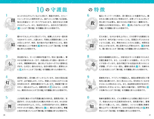 生年月日ごとに割り当てられた【宿命数】と呼ばれる数によって、守護龍のタイプが振り分けられています。まずはあなたの守護龍を調べてみましょう。守護龍ごとに1冊、計10冊の発売。ご自分の守護龍だけでなく、好きな芸能人やご家族、気になるあの人の守護龍を調べてみるのも良いかも。