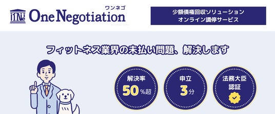OneNegotiation(ワンネゴ)は、フィットネス業界の債権回収に特化した国内初のオンライン調停サービスです。法務大臣認証を受けた裁判外紛争解決事業者(認証番号176)として、弁護士である森理俊CEO、冨田信雄COOが中心となって開発。自社督促では回収困難な債権に対し、わずか3分の申立てで従来不可能とされた50%超の解決率を実現しています。