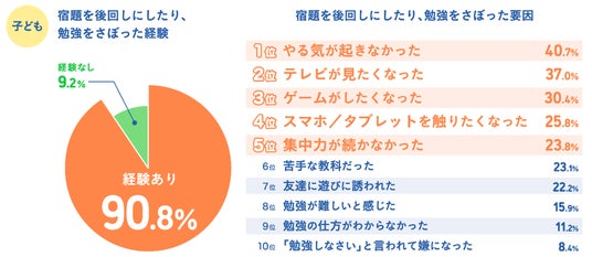 一方で子どもたちに「宿題を後回しにしたり、勉強をサボったりした経験」を聞くと、9割以上が「経験あり」と回答。その要因は「やる気」に続き、「テレビ・ゲーム・スマホ」の誘惑でした。
