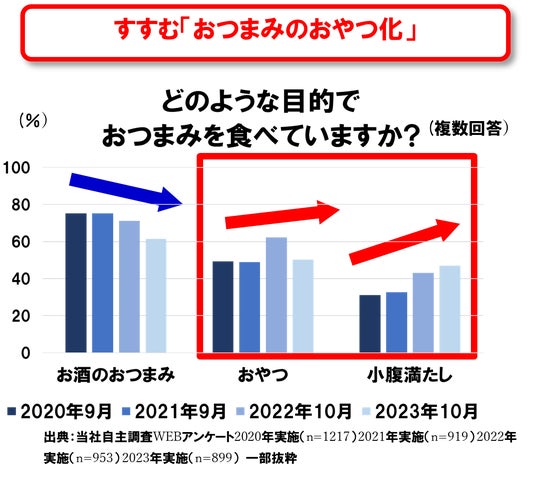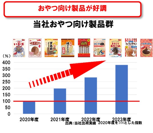 近頃徐々に、おつまみがおやつとしても食べられるようになっています。これを受け、当社ではよりおやつにぴったりな製品ラインナップを拡充しており、実績も好調です。
