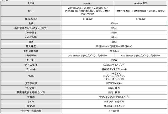 通常モデルの「wonkey」が36V 250Wに対し、「wonkey 48V」は 48V 250Wとなっております。