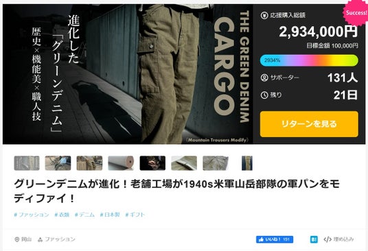 カーゴパンツ縫製に50年以上の歴史を持つ多賀株式会社(岡山県井原市、代表:多賀信祥)は、クラウドファンディングサイト「Makuake」で実施中の「グリーンデニムが進化!老舗工場が1940s米軍山岳部隊の軍パンをモディファイ!」プロジェクトが、目標金額の2934%を達成、多くのサポーターから支持を頂いたことをお知らせいたします。