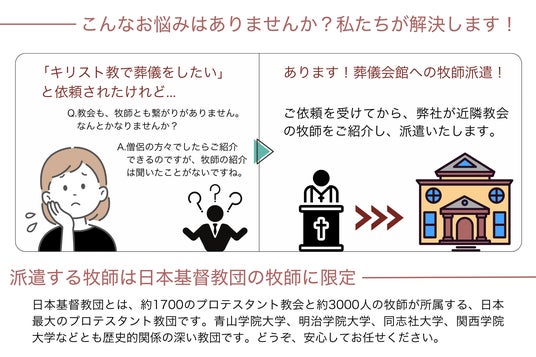 牧師派遣サービス「ともなる」(運営:株式会社グレープヴァイン、https://grapevine.co.jp/)は、キリスト教葬儀の依頼対応にお悩みの全国の葬儀社様へ向け、確かな身元の牧師を手配する業務提携の強化を開始いたします。